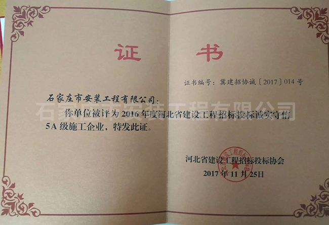 2016年度河北省建設工程招標投標誠實守信5A級施工企業(yè)